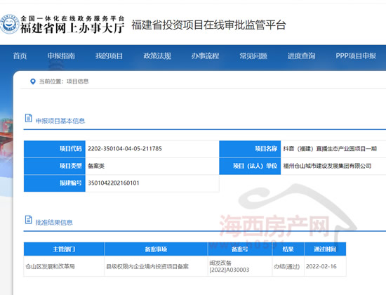批准结果信息显示,抖音(福建)直播生态产业园项目一期已通过县级权限内企业境内投资项目备案,主管部门为仓山区发展和改革局,备案号为闽发改备[2022]A030003。